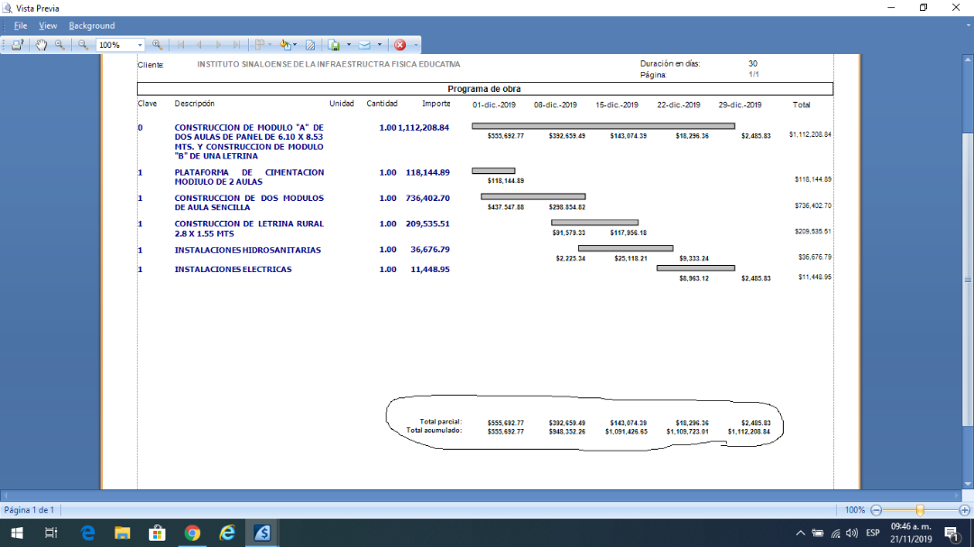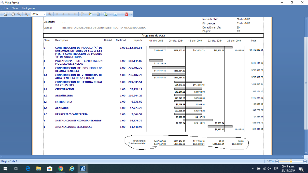 necesito imprimir un reporte del programa de obra en partidas y subpartidas, cuando se genera el reporte a primer nivel (partidas) las sumatorias (resumen TOTAL POR PERIODO) la sumatoria si se genera correcta