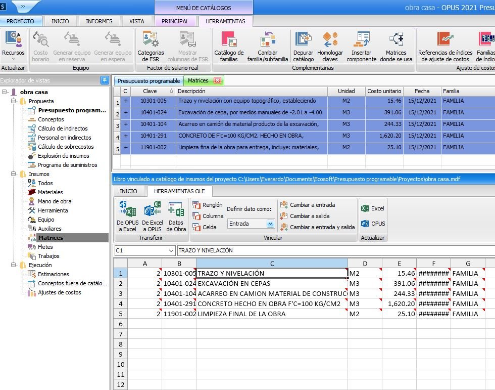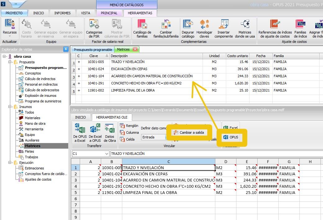 Aqui en esta vista de matrices seleccionas los conceptos y lo envías con las opciones de herramientas ole Renglón. Enseguida hace la sustitución de textos y cambias las descripciones de entrada a salida. Por último le das clic al icono de OPUS.