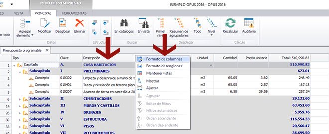 Botón derecho sobre la columna descripción de la hoja del presupuesto (Aplica para todas las vistas de OPUS).
