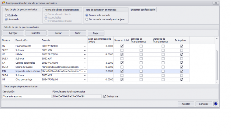 2.- Debes ir a la configuración del "Pie de precios unitarios" y ahí optar por "avanzado". En la posición que lo requieras agregas un renglón, en nombre de variable le pones "ISN" y descripción de "Impuesto sobre nómina", en la columna de porcentaje le pones 2 (o 3 o el porcentaje que requieras). luego en la columna de formula le pones "ManoDeObraSalarioBaseCotizacion * PISN/100". Marcas la casilla de suma en total y la de Se imprime. Si lo deseas en un renglon previo puedes imprimir tu total de mano de obra gravable de la misma manera, pero no marques en ese renglon la casilla de suma en total. Adjunto una imagen.