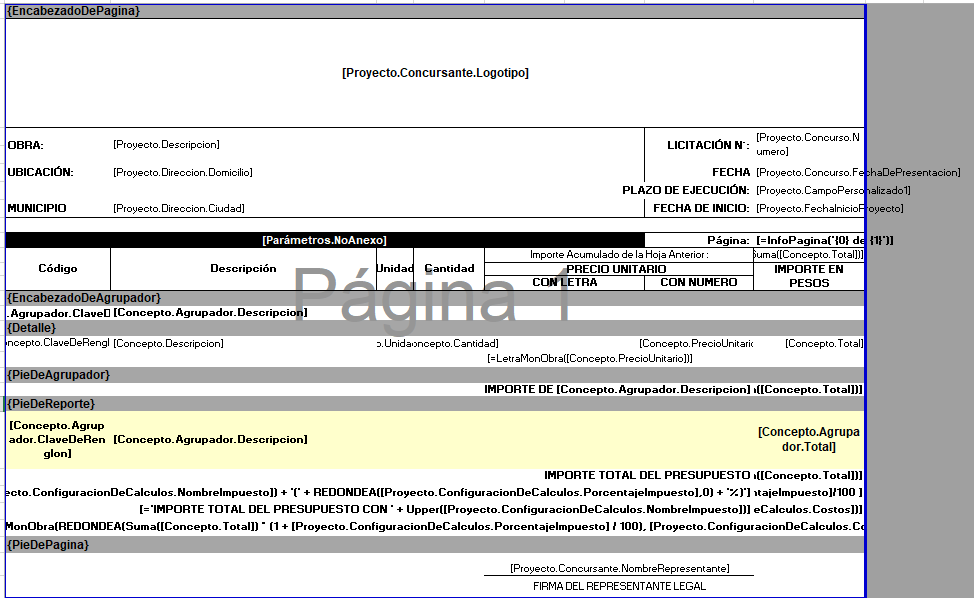 Elabore un presupuesto para una dependencia de gobierno (licitación) y esta me pidió que en el presupuesto se incluyera al final un resumen por partidas, en este caso (imagen adjunta 1) tengo agrupadores hasta de 5to nivel y lo que buscaría es que al final del reporte me mandará un resumen por agrupador del nivel 2 (claves 1, 2, 3,4,..Etc) alguien podría apoyarme a ¿cómo configurar el reporteador para hacer esto? , o si tendrá algún ejemplo que me pudiera enviar al correo (g.j.h.r.863@gmail.com). Ya que he intentado realizarlo como la imagen adjunta 2 (línea amarilla en Excel) pero solo me repite el último agrupador y su monto y no los demás y si cambio el nivel a por ejemplo [Concepto.Agrupador.Agrupador.ClaveDeRenglon] tanto para la clave del reglon, descripcion o total el formato al previsualizarlo me la manda todo en blanco osea sin contenido. saludos y gracias