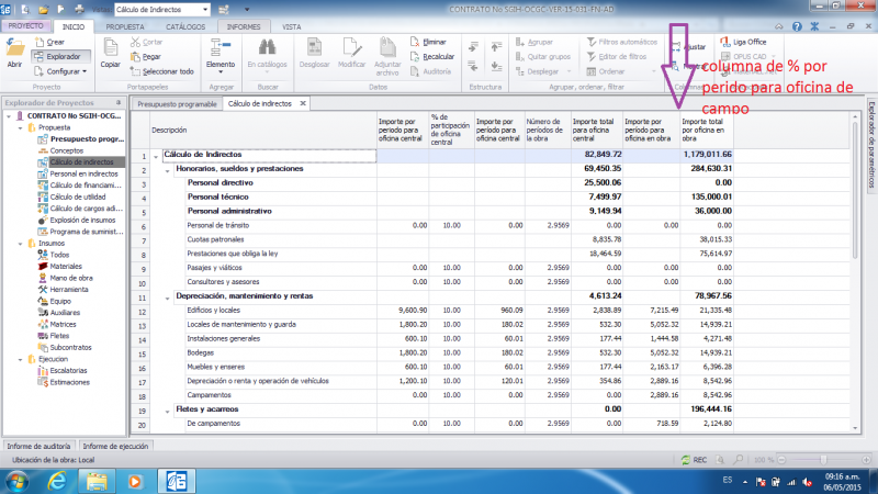 El cálculo de indirectos de OPUS 2014 difiere al de NEODATA, ya que este último cálcula los importes por porcentajes y OPUS lo hace capturando los importes directamente.